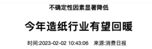 隨著2023年疫情形勢逐漸好轉和消費領域多項刺激和補貼政策的出臺,國內整體經濟逐步復蘇,受到疫情沖擊的消費需求加快恢復,造紙和包裝行業景氣度呈現底部上升趨勢。